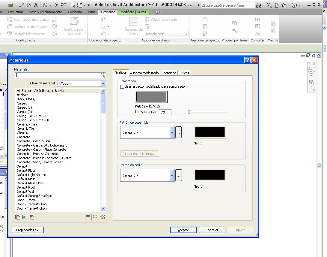 Para poder definir estos materiales, se utiliza el cuadro de diálogo Materiales de la ficha Gestionar. Además de los materiales que aparecen en este cuadro, se pueden definir materiales diferentes.