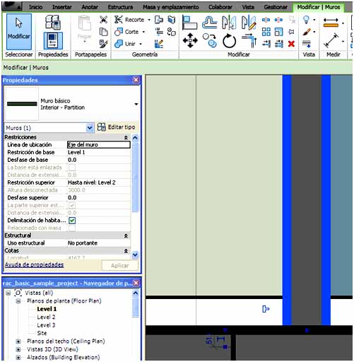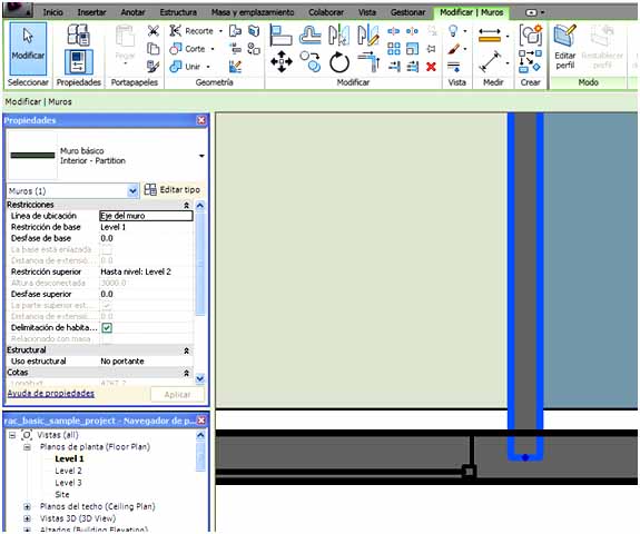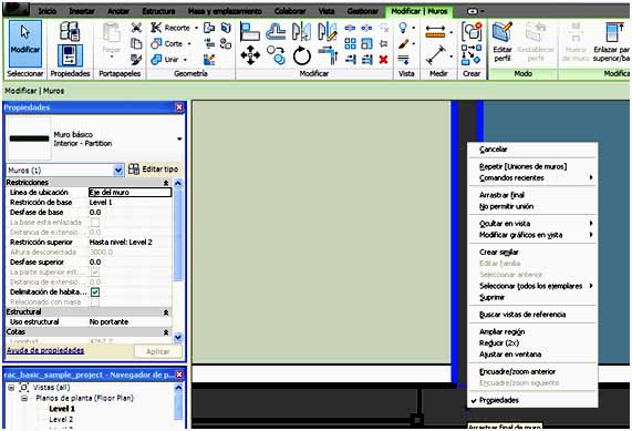 No permitir unión es otra de las opciones que se pueden utilizar para obtener un mejor diseño en la unión de muros. Si se quiere modificar por ejemplo, la unión de un tabique con un muro de fachada, se puede seleccionar el tabique y hacer clic con el botón derecho del ratón, encima del punto azul que aparece en el extremo del tabique, cuando se encuentra con la fachada, y elegir del menú contextual que aparece No permitir unión, de forma que se desactiva la unión automática.
