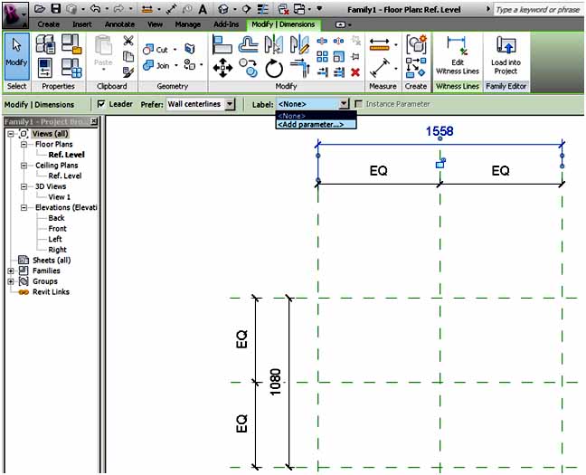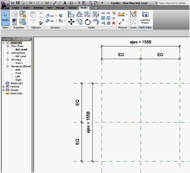 Una vez que tenemos las cotas parciales entre planos de referencia equidistantes, se realizan cotas totales en estos planos de referencia creados (que corresponde a la cota entre ejes de las patas de la mesa), se selecciona la cota total y en el menú superior perteneciente a la opción acotar, en la opción etiqueta, se añade un parámetro: ejes.