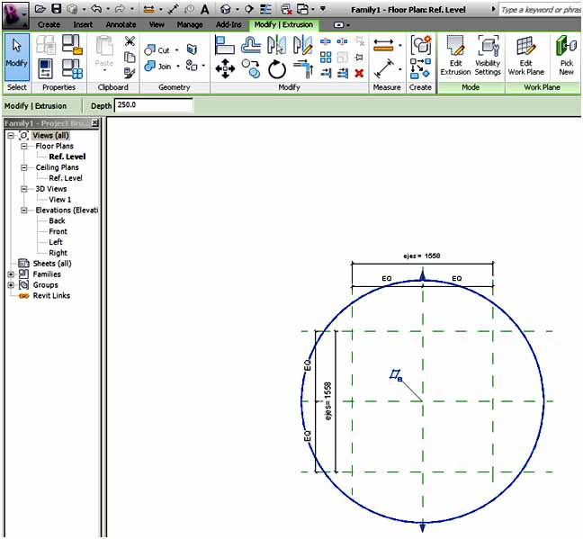 El tablero circular de la mesa se creará por medio de una extrusión. Con Crear-extrusión, primeramente se puede crear un círculo, dando el dato de un radio, no importa el valor numérico del radio y finalizar la orden Extrusión. Se genera el tablero de la mesa que Revit me lo sitúa en el nivel 0 y con grosor del tablero que decide el programa, por lo que hay que crear previamente planos de referencia horizontales, con los que definir la altura del tablero respecto el nivel 0 y el grosor de dicho tablero.