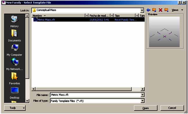 Vamos a realizar una familia nueva, y esta familia se guardará en la carpeta de Masa conceptual. Después se editará la Masa. Concretamente, se abrirá el archivo comentado anteriormente al hablar de Masas conceptuales, Metric Mass (Masa métrica), que como se indicó contiene tres planos como base de realización de la Masa.