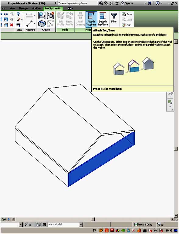Una vez que se ha construido la cubierta, se han de enlazar los muros inferiores a la misma, y para esto hay que seleccionar los dos muros, y se han de mantener seleccionados con la tecla Control, y es cuando se va a la opción Enlazar (editar) base superior, y se  selecciona la cubierta. Los muros se enlazan a la cubierta.