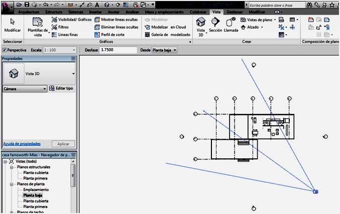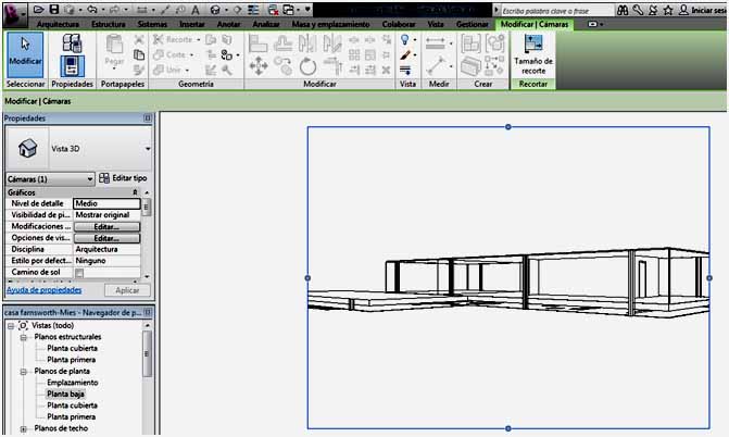 Para modificar la vista de la cámara, se ha de seleccionar el marco de la perspectiva – vista que nos ha creado la cámara, y hay que ir a la vista en planta donde se ha colocado la cámara. Aparece la cámara en planta, y el cono de visión, y es entonces cuando se puede mover la misma así como el cono de visión.