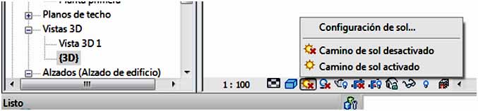 Con la opción sol de la barra de herramientas inferior, se determina el recorrido del sol en el proyecto, el cual se puede cambiar y definir para un día concreto.
