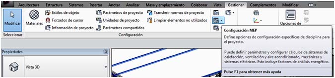 Primeramente, hay que configurar los parámetros de las instalaciones. En Gestionar-Configuracion MEP, existen tres posibilidades: Configuración Mecánica, y Configuración eléctrica, que nos permiten acceder a unos cuadros de diálogo, donde se puede configurar la forma de representar cada una de las instalaciones.