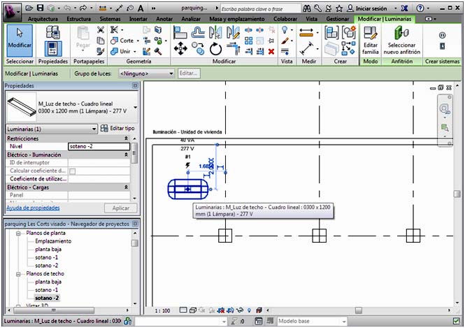 Las luminarias también se encuentran en el cuadro de navegación, por lo que también se pueden colocar arrastrando las mismas desde dicho cuadro hasta la planta. Cada luminaria tiene un plano anfitrión por defecto, por lo que en el caso de una luminaria para plano vertical, la familia busca una cara vertical donde insertarse porque está pensado así, aunque se puede cambiar
