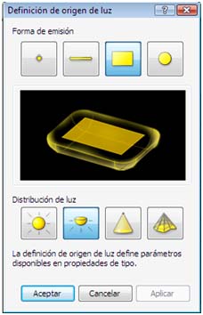 Si seleccionamos la luminaria, y en el cuadro de navegación, elegimos la opción Definición de origen de luz – Editar, aparece el siguiente cuadro, donde se clasifica la luminaria en un tipo de Forma de emisión y de Distribución de la luz. Características que pueden ser modificadas en función de las necesidades del proyecto.