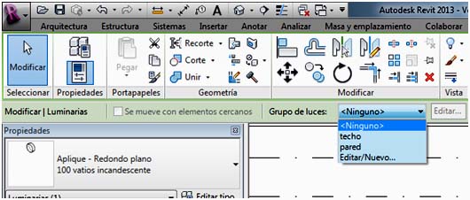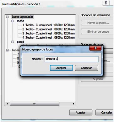 También se pueden agrupar algunas luminarias formando un grupo. Para ello hay que seleccionar la luminaria e ir a la opción de Grupo de luces, que se encuentra en la barra horizontal superior, e indicar Editar/Nuevo.
