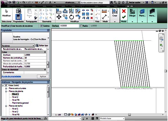 Se han creado 16 contrahuellas que son las necesarias para salvar el desnivel, y con estas opciones el programa también te informa, de cuantas contrahuellas faltan, en función de las creadas, para llegar al nivel indicado (en este caso cero, porque ya se han creado todas las contrahuellas).