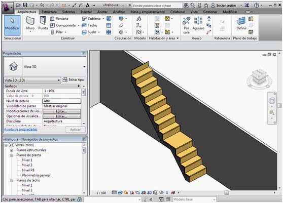 El programa, cuando realiza una escalera, dibuja por defecto la posición de la barandilla, coincidiendo con la línea contorno de la escalera. Para realizar otras posiciones de las barandillas, respecto la escalera, se ha de utilizar el concepto de Boceto de camino, que es el recorrido en planta de la escalera y Seleccionar nuevo anfitrión, ya que la barandilla se aloja en un anfitrión, como es la escalera.