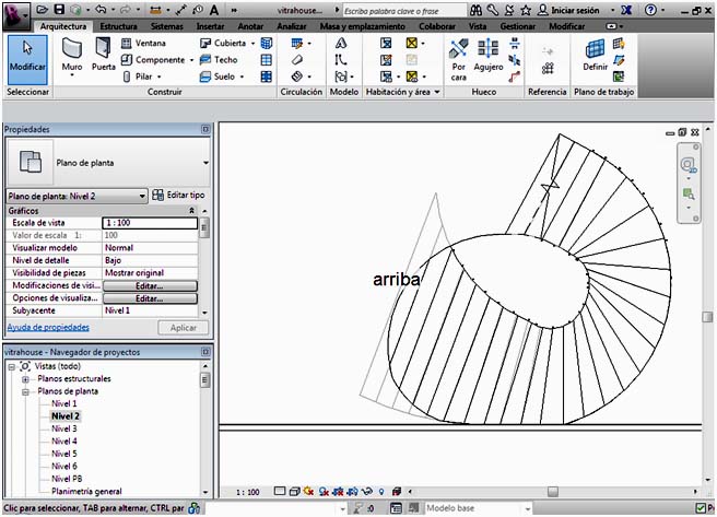 Si se tiene que modelar una escalera singular, con geometría compleja, como la del siguiente ejemplo, se puede realizar por medio de la opción Arquitectura – circulación – escalera – Escalera por boceto, y luego utilizar las opciones de Contorno y Contrahuella, para realizar la escalera. Para obtener más detalles sobre estas opciones, se puede consultar los artículos anteriores Escaleras (3) y (4).