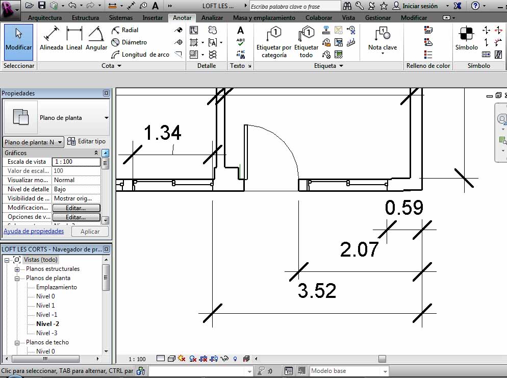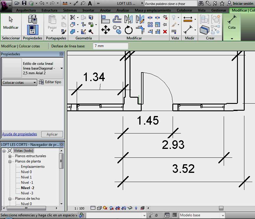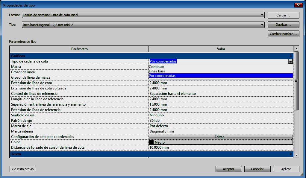 Para utilizar este tipo de cotas hay que ir a Anontación – Cotas – (Alineada o lineal), y en el cuadro de propiedades, ir a la opción Editar tipo, donde hay que realizar un duplicado del estilo de cota que interese, para siempre mantener el estilo de cota del programa sin alterar. Una vez realizado el mismo, hay que ir a la opción Gráficos – Tipo de cadena de cota, y elegir una de las dos opciones que aparecen: Línea base o Coordenadas.