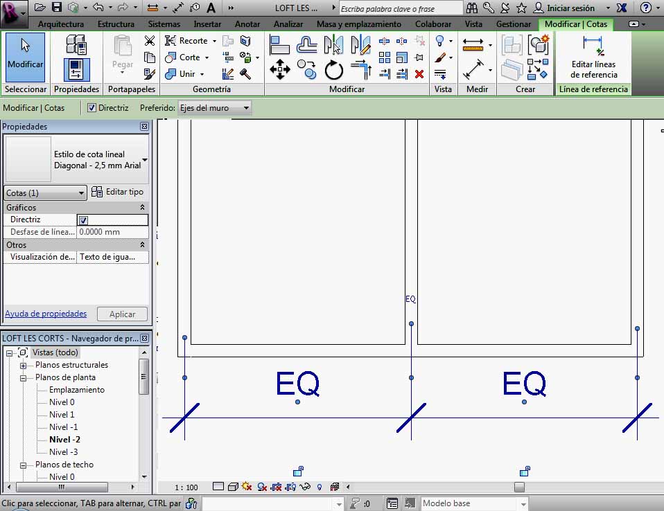 Cuando se realiza una cota de varios segmentos (varias cotas que forman una única entidad de cota, y que se realiza seleccionando todos los puntos de referencia de la cota, antes de situar la cota y finalizar la opción), si se selecciona la misma, aparece una letra E/Q, el símbolo de igualdad de cota, que estará desactivado, si las cotas no tienen el mismo valor numérico.