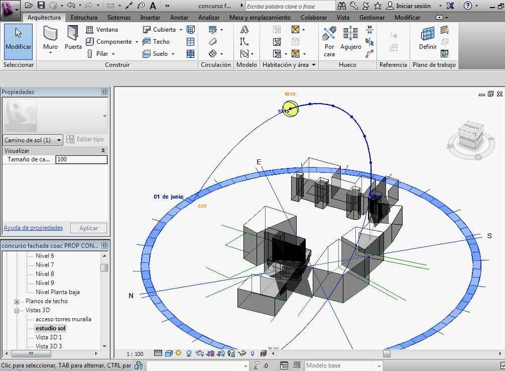 Hay que situar el ratón encima de cualquier elemento del camino del sol, como por ejemplo, la brújula, y pulsar el botón derecho del ratón, eligiendo la opción Un día. Ahora se trata de mover el sol a lo largo del camino, y de la zona de estudio (marcada en azul oscuro en el camino del sol), a las posiciones que se desee.