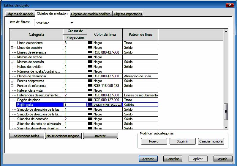 En Gestionar- Configuración- Estilos de objeto- Objetos de anotación – Categoría – Rejilla de guía, se puede modificar el grosor, color y patrón de la línea de la rejilla.