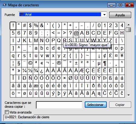 Si se desea utilizar Caracteres especiales, es posible realizarlo con el siguiente proceso: hay que ir al Menú de Inicio de Windows – Ejecutar, y en el cuadro de diálogo que aparece, hay que escribir charmap. Aparece otro cuadro donde se encuentran los caracteres de Windows, y se ha de seleccionar el que interesa. Hay que Copiar esta selección, e ir a la Nota de texto, que se selecciona, activando el Cuadro de texto. Con Modificar/Notas de texto – Portapapeles – Pegar aparece el caracter en la Nota de texto.