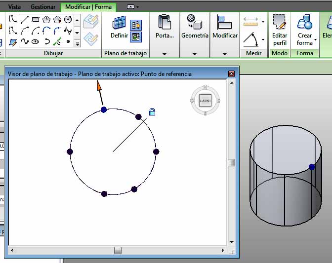 Por ejemplo, tenemos la masa Cilindro, y establecemos un Plano de trabajo, como el círculo superior. Se abre el Visor de plano de trabajo donde se puede apreciar el círculo superior visto en planta. Directamente desde el Visor de plano de trabajo y, moviendo los pinzamientos que tiene el círculo, se puede deformar la masa, obteniendo el siguiente resultado.