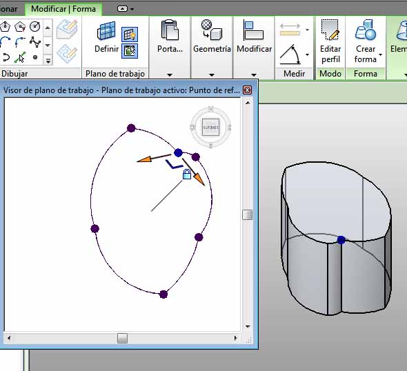 Se define como Plano de trabajo actual el círculo que ha generado el toroide, y desde el Visor de plano de trabajo, actuando sobre los pinzamientos del mismo, se modifica el perfil del mismo, de forma que se obtiene el siguiente resultado sobre la Masa: