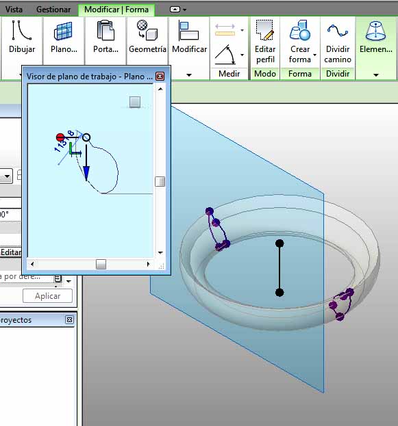 Existe la opción Plano de trabajo – Visor de plano de trabajo, que se trata de una Vista temporal que no se va a guardar en Navegador de proyectos, y que permite ver el Plano de trabajo y los elementos que se han dibujado en el mismo, los cuales en esta Vista temporal, se pueden modificar. Estos elementos que se pueden modificar son los elementos generadores de extrusiones, barridos y fundidos de barrido.
