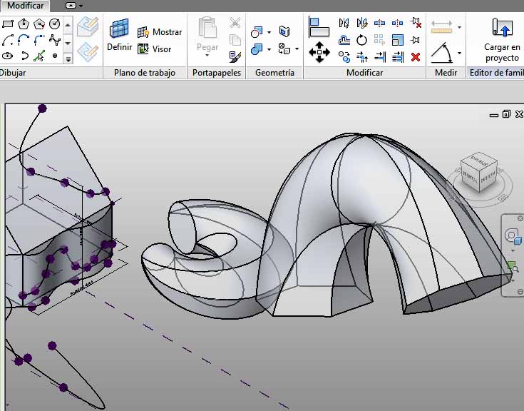 Hay que seleccionar los perfiles y el camino de forma simultánea, e ir a Modificar/líneas – Forma – Crear forma. Se obtiene la forma siguiente.