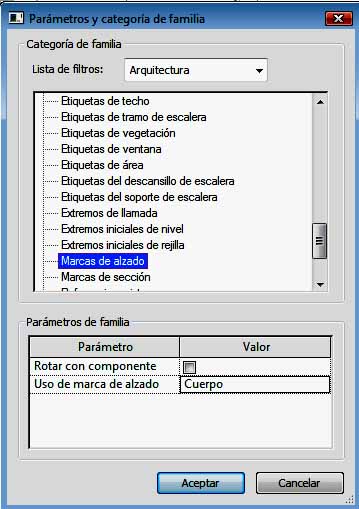 Se ha de seleccionar Marcas de alzado, y en la opción Uso de marca de alzado se ha de elegir la opción Cuerpo. Se ha de dibujar el cuerpo de la etiqueta y colocar el texto. Hay que guardar la familia.