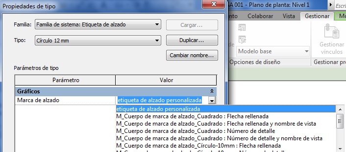 Esta Etiqueta de alzado se carga en el proyecto. Desde Proyecto hay que ir a Gestionar – Configuración – Configuración adicional – Etiquetas de alzado. Se ha de duplicar el tipo y en el campo del parámetro de tipo de marca de alzado se ha de indicar el nombre de esta Etiqueta de alzado creada y que se ha cargado en el proyecto.
