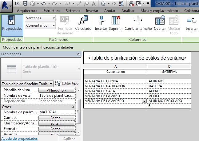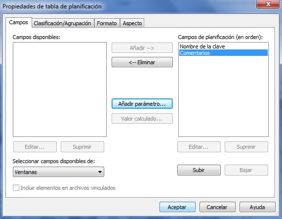 Por ejemplo, se puede realizar una tabla de planificación de Ventanas de un proyecto, que por ejemplo, se necesita mostrar en dicha tabla el concepto de Material. Como el mismo no es uno de los Campos que el programa establece por defecto para la Categoría Ventanas, se puede crear una Clave que Material.