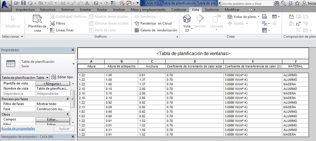 El siguiente paso es Crear una Tabla de planificación de Ventanas, incluyendo como Campo la Clave que se ha creado anteriormente, que en nuestro caso es Material. Se obtiene una tabla similar a la siguiente (con los demás campos incluidos que interesen en el proyecto):