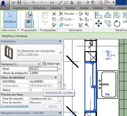 Cada elemento al cual se le ha dado esta clave, cuando se selecciona el mismo, dicha clave aparece en su Cuadro de propiedades. Por ejemplo, en nuestro caso si se selecciona una de las ventanas del proyecto, en Datos de identidad, del Cuadro de propiedades de la ventana, aparece la clave Material que se ha definido.