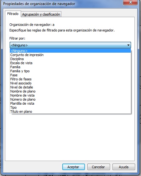 Además se pueden crear nuevos conceptos para ordenar las Vistas o Planos. Para ello, y dentro del Cuadro de diálogo de Organización del navegador, se ha de seleccionar la opción de Nuevo, se ha de dar un nombre al grupo de filtrado, y aparece el siguiente Cuadro de diálogo Propiedades de organización del navegador, donde se han de determinar las propiedades de la Nueva propiedad. En este cuadro hay que elegir en Agrupar por el tipo de propiedad de la Vista o Plano por la que se quiere establecer la agrupación. Estas propiedades deben estar definidas previamente en la Vista o Plano para que cuando se aplique el Filtro este funcione bien. Para poder modificar las propiedades de una Vista o Plano hay que realizar botón derecho en el Navegador de proyectos sobre el nombre de Vista o Plano y hay que elegir Propiedades.