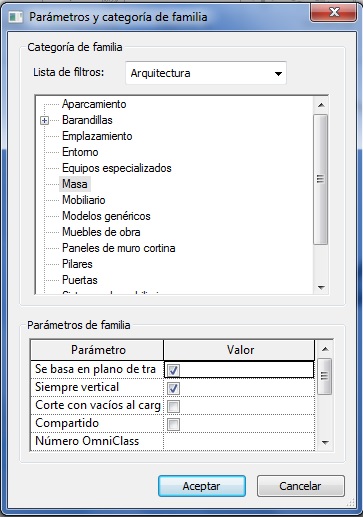 En el siguiente ejemplo se tiene una Familia no hospedada ( Componente). En Inicio – Propiedades – Parámetros y Categoría de familia aparece un Cuadro de diálogo Parámetros y categoría de familia, y en Parámetros de familia está seleccionada la opción Basado en plano de trabajo.