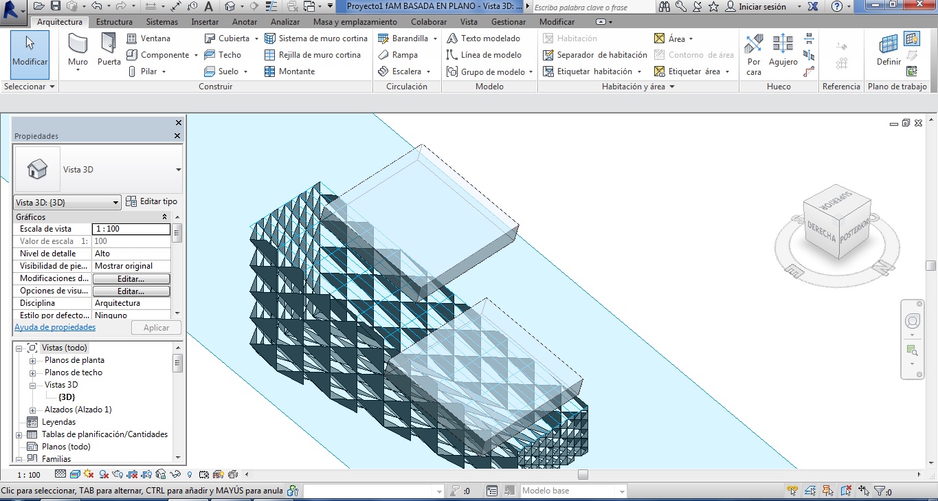 Esta familia se ha insertado en Otra familia con el resultado que se muestra a continuación. El plano al que está asociado la familia que se inserta es el plano inclinado superior del volumen en forma de prisma.