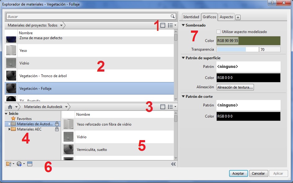A continuación se indica las partes que componen el Cuadro de diálogo de Explorador de materiales: