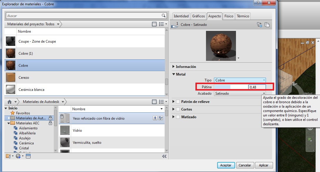 – Pátina. Este parámetro es para los materiales cobre y bronce, y define el grado de decoloración del material por la oxidación o bien el tratamiento con un producto químico. El valor cero corresponde a ninguno y el valor 1 corresponde al máximo.