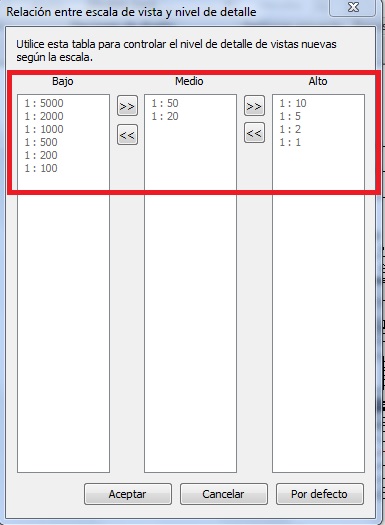 Por medio del cuadro de diálogo Relación entre escala de vista y nivel de detalle, se puede determinar y modificar los valores de escala para cada nivel de detalle de la vista : Bajo, Medio y Alto.