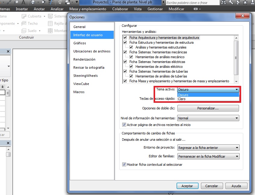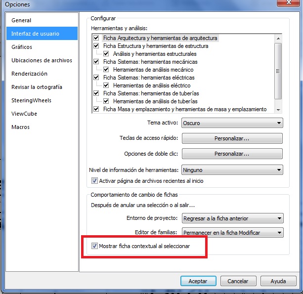 – Mostrar ficha contextual al seleccionar. Se muestra la ficha contextual para un elemento que se selecciona sin tener que hacer ninguna operación con el ratón, de forma que el programa muestra las herramientas del mismo. Si la opción está desactivada la ficha contextual del elemento seleccionado se abre pero la ficha que está activa es la ficha que teníamos abierta. Hay que hacer clic con el ratón en la ficha contextual para acceder a la misma.