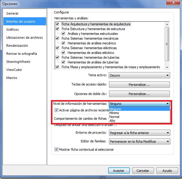 – Nivel de información de herramientas. El valor por defecto es normal y se trata del nivel de información de las herramientas de la cinta de opciones. La opción Ninguno significa que cuando se pone el cursor del ratón sobre una herramienta la interfaz del programa no muestra información sobre la misma, siendo el caso contrario con opciones como Normal o Alto.