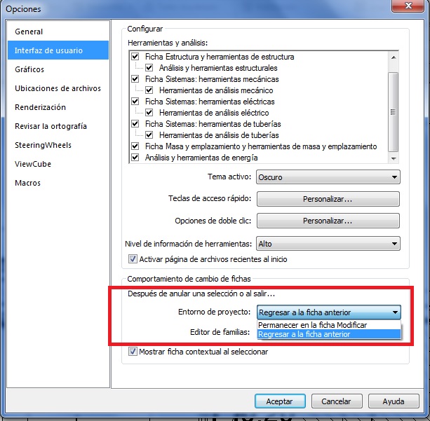 - A) Permanecer en la ficha Modificar. Después de seleccionar un elemento del modelo o salir de una herramienta, con esta opción activa se mantiene la ficha Modificar.