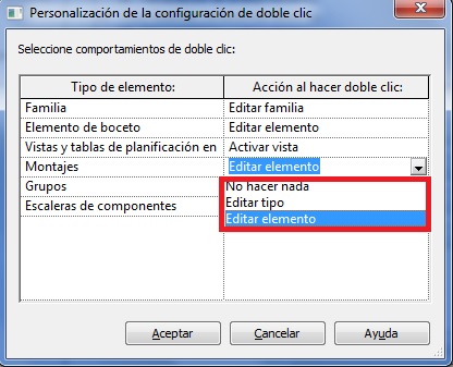 Aparecen las opciones para los diferentes tipos de elementos que son básicamente No hacer nada cuando se realiza el doble clic o bien Editar el elemento, y en algunos casos Editar tipo.