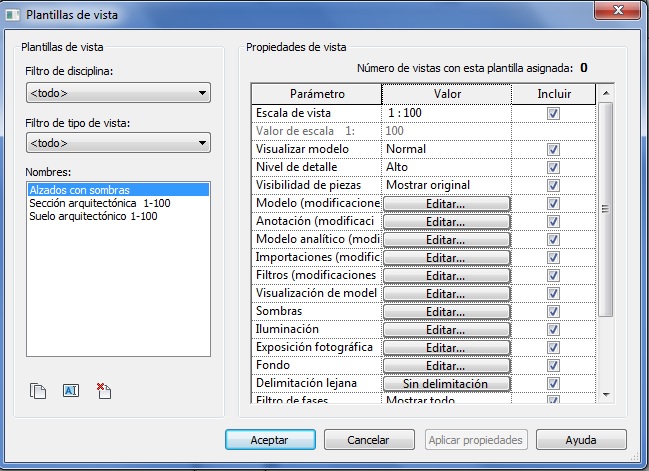 - Se ha de modificar los valores de propiedades de plantilla de vista según sea necesario para el proyecto. La opción Incluir funciona según lo comentado en los párrafos anteriores para el caso de creación de plantilla nueva.