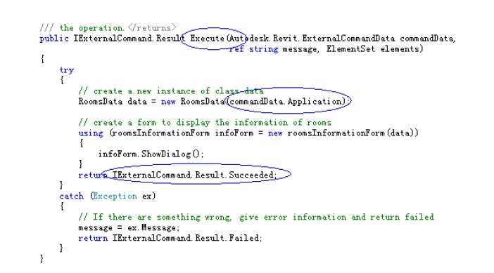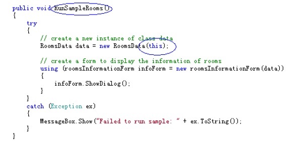 La actualización del código de muestras del SDK puede ser cambiar la entrada de una muestra de VSTA. Por ejemplo la entrada inicial era el método RunSampleRooms() y se quiere utilizar la interfaz IExternalCommand, por lo que se ha de eliminar los parámetros del método y la devolución del método Execute. La nueva entrada será RunSampleRooms(). También en el cuerpo central se ha de sustituir commandData.Application por this.