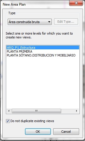 Aparece el siguiente Cuadro de diálogo, donde hay que elegir la opción de Área construida bruta y el nivel de planta donde se quiere calcular la superficie. Hay que deseleccionar la opción No duplicar vista existente. No duplicar vista existente