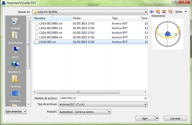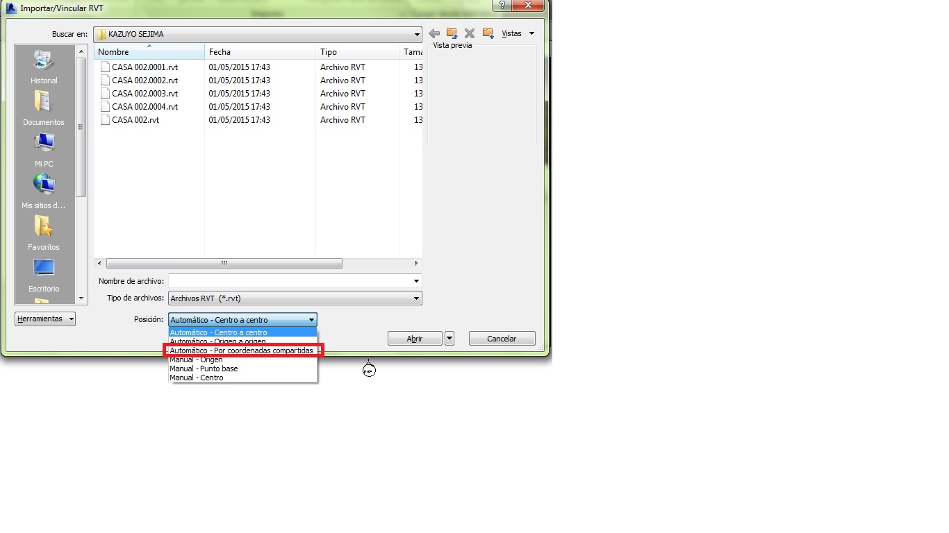 Hay que seleccionar el archivo que se quiere vincular. En la opción Posición por defecto el programa indica Automático – centro a centro. En el caso de que el proyecto vinculado se vaya a situar por Coordenadas compartidas hay que elegir la opción Automático – Por coordenadas compartidas.