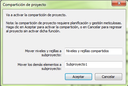 En este Cuadro de diálogo aparecen por defecto los Subproyectos creados por el usuario: niveles y rejillas compartidos y Subproyecto 1. Se puede cambiar el nombre de estos Subproyectos. Si se indica Aceptar aparece otro Cuadro de diálogo Subproyectos: