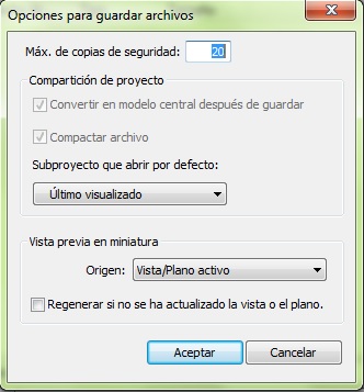 Hay que ir a Opciones, del Cuadro de diálogo Guardar como, de forma que aparece otro cuadro Opciones para guardar archivos, donde se ha de activar la casilla Convertir en modelo central después de guardar, y Compartir archivo. Si es la primera vez que se guardar el archivo después de realizar la activación del modelo central, esta opción estará seleccionada por defecto y además no se puede modificar.