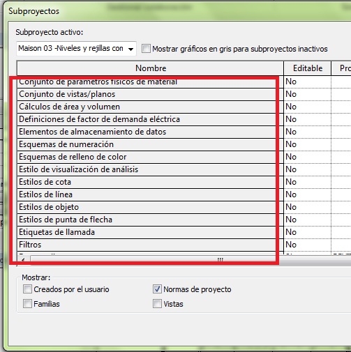 c) Vistas. Contiene todas las Vistas del Proyecto: Vista de nivel X de Planta, Vista de sección, Vista de alzado… Contiene además las Propiedades de la Vista y cualquier elemento específico de la Vista como pueden ser las cotas o notas de texto. Nunca puede ser un Subproyecto activo, pero sí que tiene que tener la característica de Editable cuando se quieren modificar elementos específicos de la Vista, en caso, contrario, no se pueden modificar los mismos, y se tiene que modificar la opción de No editable a Editable. Es un Subproyecto al cual no se puede modificar el nombre y no se puede suprimir. Tampoco se pueden cambiar sus elementos a otros Subproyectos creados por el usuario o por defecto. Si se crean nuevos elementos específicos de Vista, el programa los añade de forma automática a este Subproyecto.