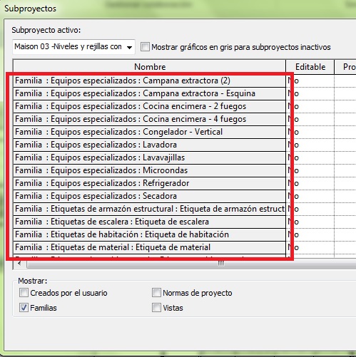 b) Familias. Todas las familias del Proyecto forman parte de este Subproyecto. No se puede modificar el nombre de este Subproyecto ni se puede eliminar.