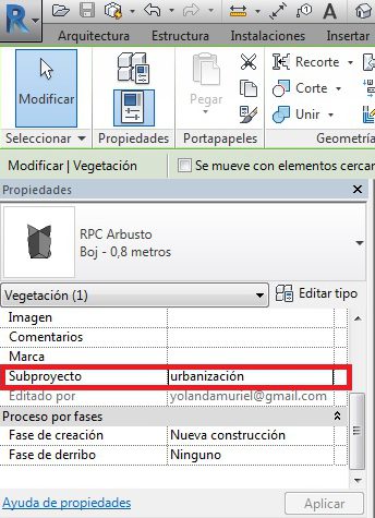 En la siguiente imagen se puede ver seleccionado elementos de vegetación de un proyecto, y cómo en el Cuadro de Propiedades aparece la posibilidad de modificar el Subproyecto al que pertenecen.