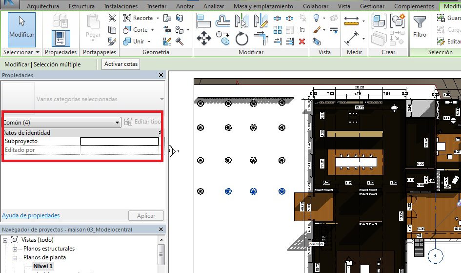 Puede ocurrir que cuando se realice una selección múltiple de elementos, se seleccionen elementos que pertenecen a un Subproyecto no editable como es el caso de elementos específicos de una vista (cotas, etiquetas de nota, anotaciones diversas…). En este caso no se puede editar el parámetro Subproyecto que se encuentra en el cuadro de Propiedades.