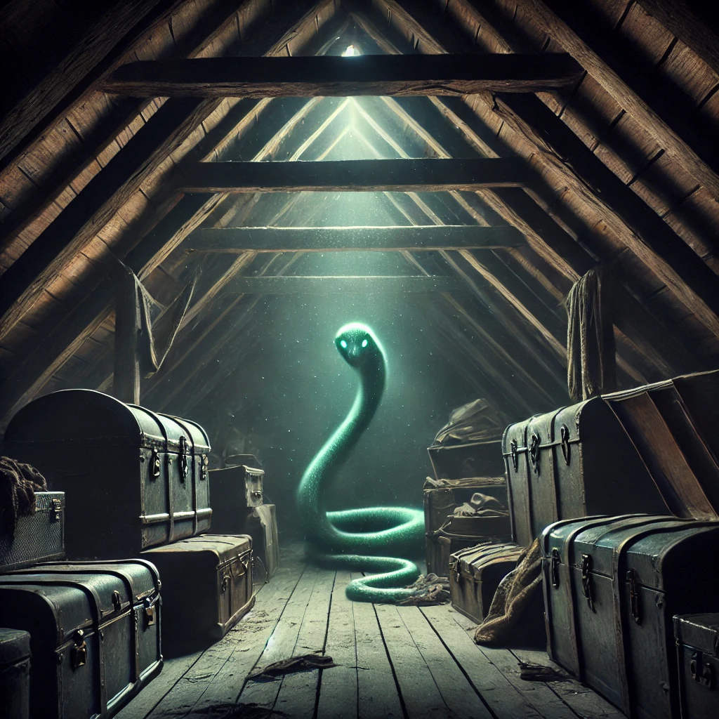 The attic door groaned as it swung open. A faint shuffling sound echoed from the gloom. I peered inside, but the dim outlines of trunks and battered suitcases were all I could make out. The air carried a musty scent of age and dampness. I propped the door open wider. Light spilled into the shadows.
